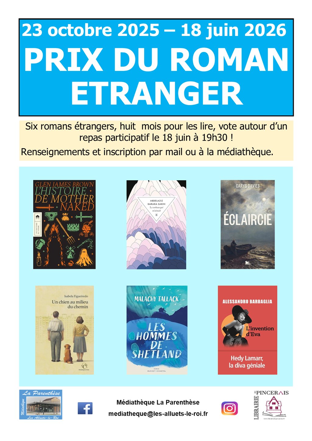 Le Prix du Polar 2026 et le Prix du Roman Etranger 2026, organisés par la médiathèque en partenariat avec la librairie du Pincerais, sont désormais lancés : 8 mois pour lire 8 polars et/ou 6 romans avant de se retrouver le 18 juin autour d'un repas pour débattre et voter.