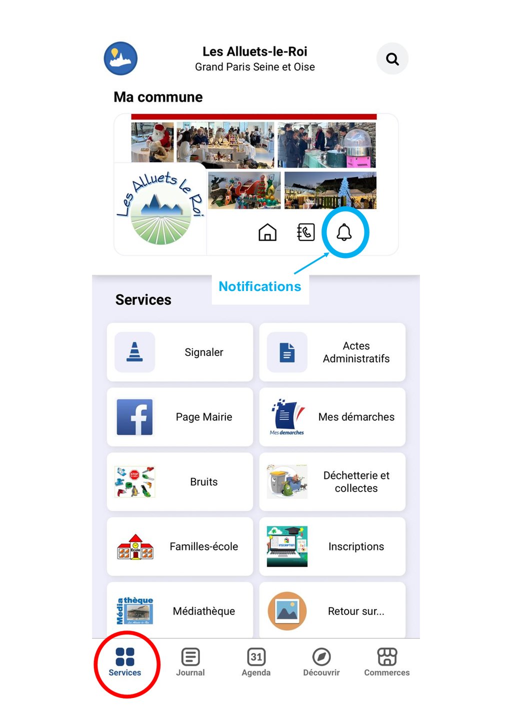 Sur la page d'accueil "services", il vous suffit de cliquer sur la cloche (voir image) pour cocher ou décocher les notifications qui vous intéressent.