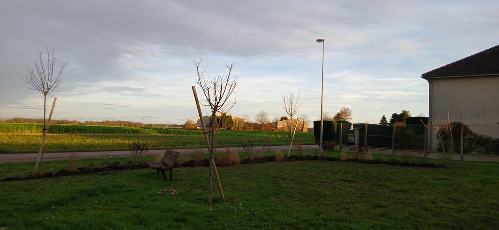 Une haie arbustive composée de 12 espèces de végétaux a été plantée. Ce petit coin de verdure sera agrémenté d'une table de pique-nique au printemps pour profiter d'une pause avec vue sur les champs !